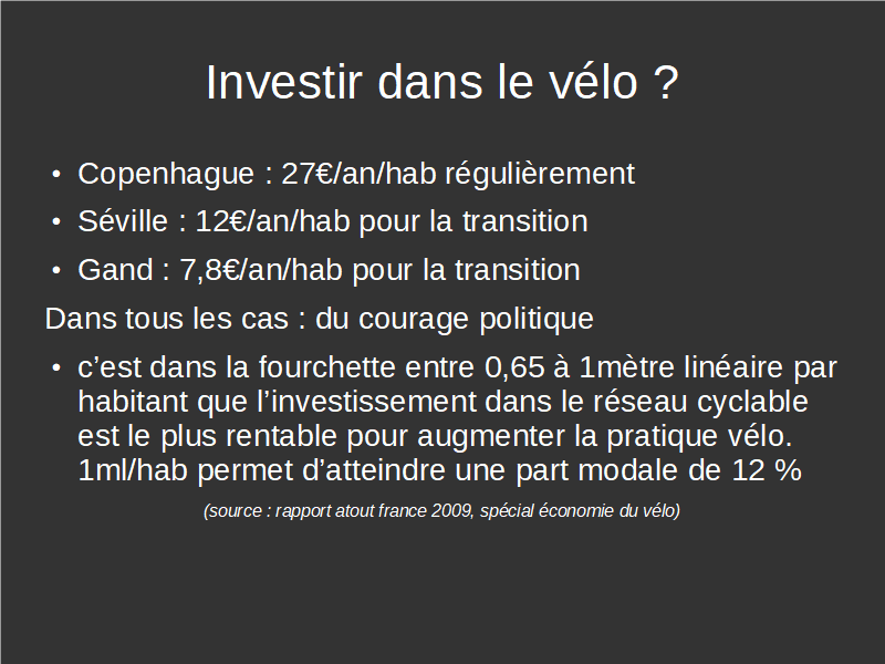 Lors de la première partie de la présentation, les élus nous ont informé que nous « prêchions des convaincus ». Cette diapo a été l’occasion d’insister sur la nécessité d’investir au moins 10€ par an et par habitant pour afficher une réelle conviction. Soit 800 000 euros par an à l’échelle de Pau, et 1 650 000 à l’échelle de l’agglo.