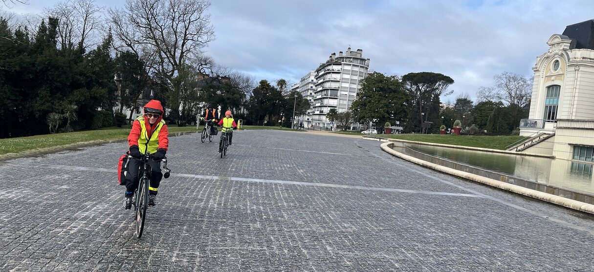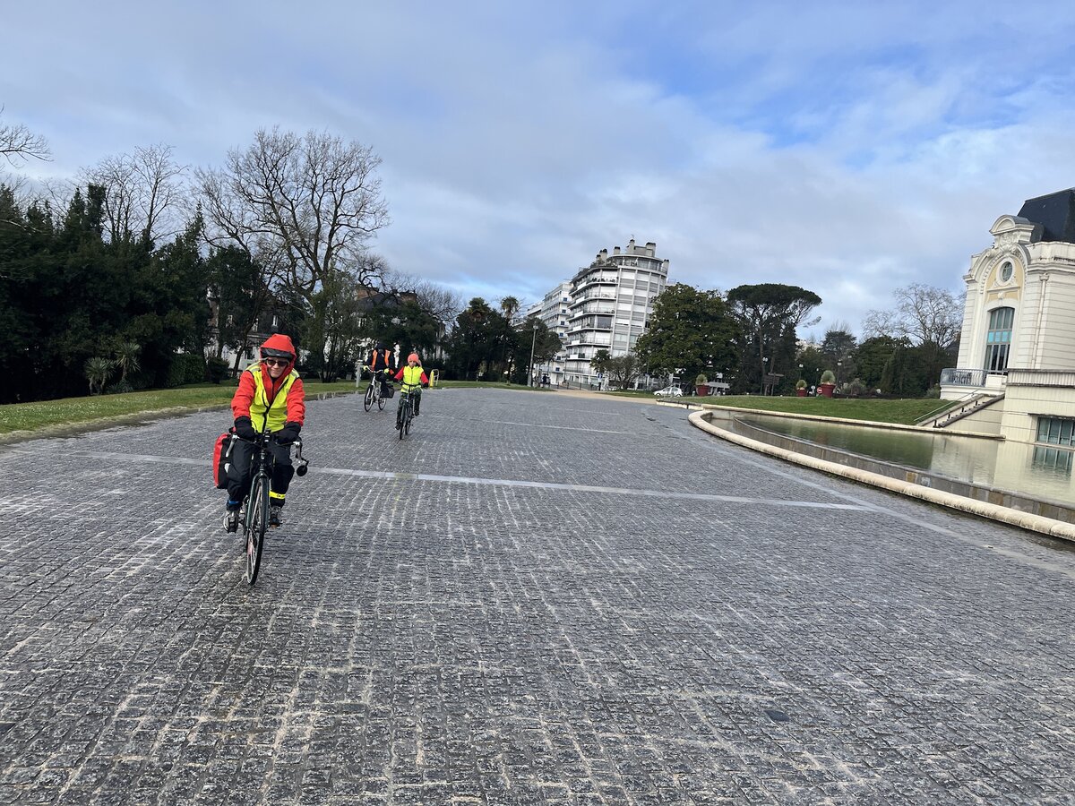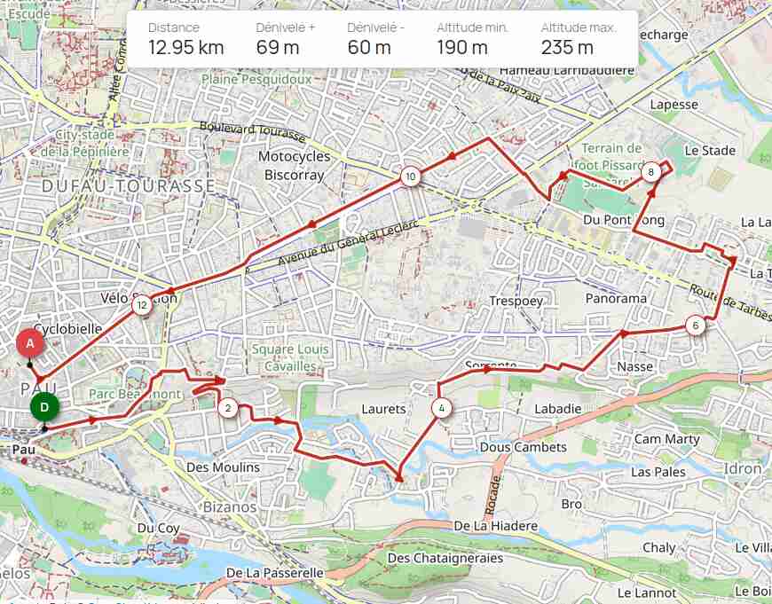 Cette fois, nous sommes allés vers l’est, pour une petite boucle en ville (Pau, Bizanos, Idron) où nous avons privilégié les pistes cyclables et les rues calmes. Le parcours a fait une bonne douzaine de km, nous sommes descendus (puis remontés) au niveau de l’Ousse ce qui a fait 80m de dénivelé environ. Nous sommes descendus par l’avenue Nitot et remontés par la rue des Frères Cousté à Bizanos, où la pente est douce et régulière.