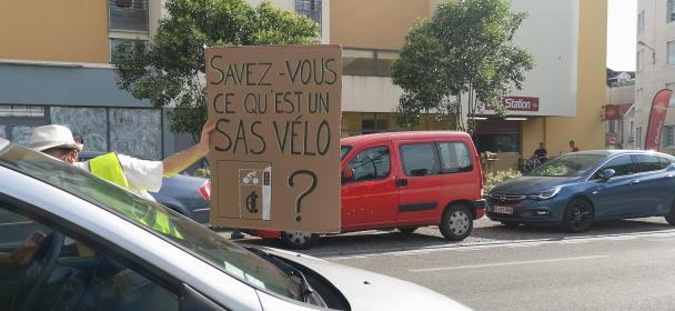 Notre association a mené une action de sensibilisation au sas vélo, auprès des automobilistes qui circulaient sur le boulevard Alsace Lorraine. Le sas vélo, c’est la zone réservée aux cyclistes juste devant le feu rouge, pour qu’ils puissent s’y positionner en premier devant toutes les voitures. Pour aider à voir et respecter cet espace, une barrière physique était mise en place à chaque passage au rouge du feu.