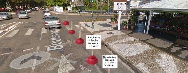 Résultat: sans les plots les conducteurs coupent le virage et se rabattent tout de suite. Avec les plots les véhicules, obligés de ralentir, tournent à droite plus doucement et plus largement, évitant le cycliste. Cette action de ville partagée a eu un fort retentissement médiatique: France Bleu, France3 Aquitaine, La République, Sud-Ouest. Vous pouvez retrouver tous ces reportages, ainsi que le descriptif de l’expérimentation sur [le blog de ville partagée] (http://www.villepartage.com/ )