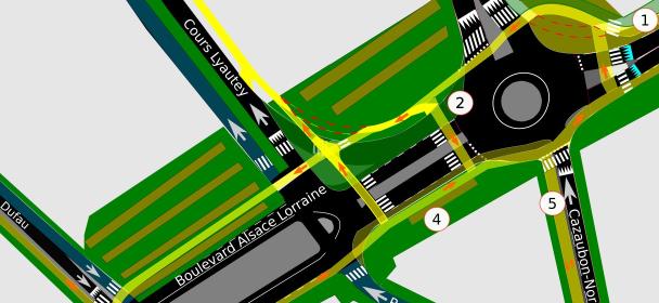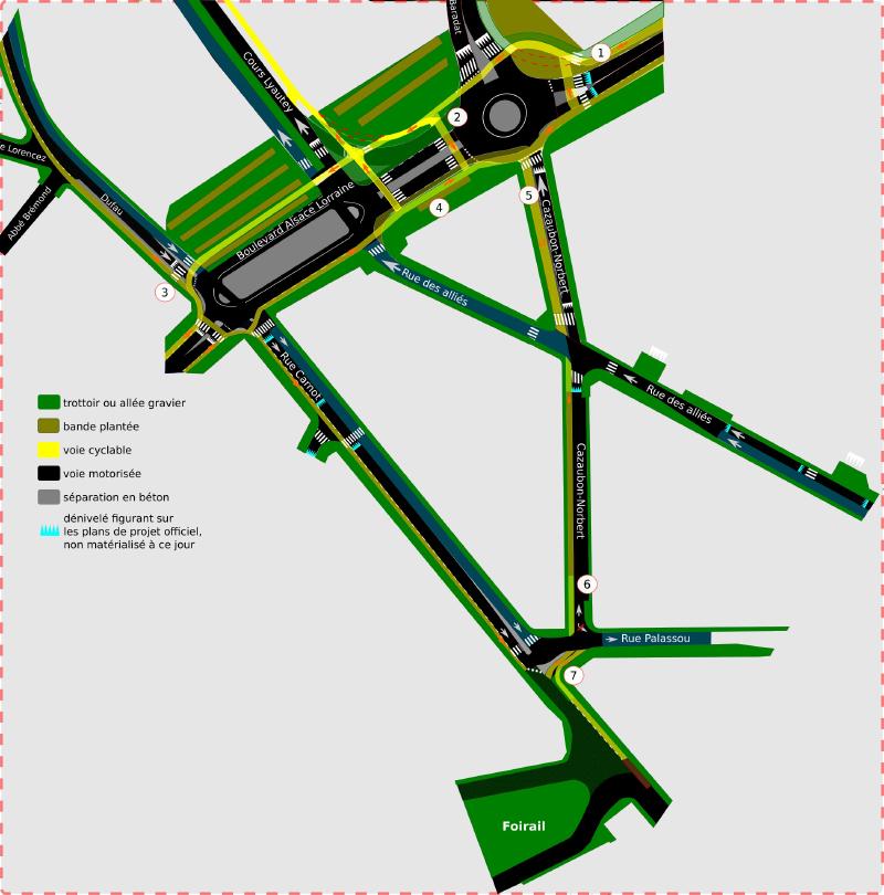 - Sur Alsace-Lorraine, la voie dédiée aux véhicules qui tournent à droite après le rond-point est supprimée, un accès vélo est créé pour ceux qui viendraient via la voie de bus (Alliés) pour aller vers lyautey ou tourner à gauche. Le tracé actuel de la piste cyclable en pointillés rouges n’est pas conservé pour éviter de trop nombreuses intersections avec les piétons. Une traversée piéton/vélo supplémentaire est aménagée en sortie du rond point pour les personnes en provenance de l’avenue Baradat ou Alsace Lorraine et souhaitant rejoindre Carnot via Cazaubon-Norbert.