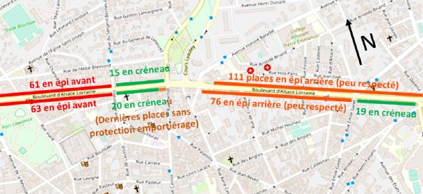 Le boulevard Alsace Lorraine est un axe important de la ville de Pau. Il est bordés de tilleuls, mais surtout de stationnement en épi des deux côtés. Ce stationnement menace directement la circulation à vélo sur les bandes cyclables. Il rend aussi les trottoirs indignes car inaccesibles aux personnes à mobilité réduite. Nous avions rédigé un courrier d’alerte sur le sujet le 14 juin 2021 .
