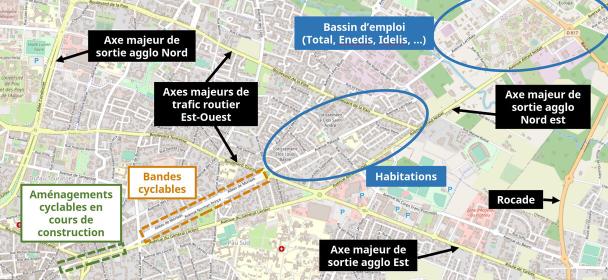 Le 9 juillet 2022, un article du journal la République relatait un projet de rénovation porté pour l’avenue Peboué. La mairie proposait une “voie verte” sur trottoir que nous trouvions très décevante. Cette avenue est en effet un axe important qui se trouve au bout des Allées de Morlaàs, au Nord-Est de Pau. Il est sur le trajet qui relie le centre ville au bassin d’emploi proche du CST de Total.